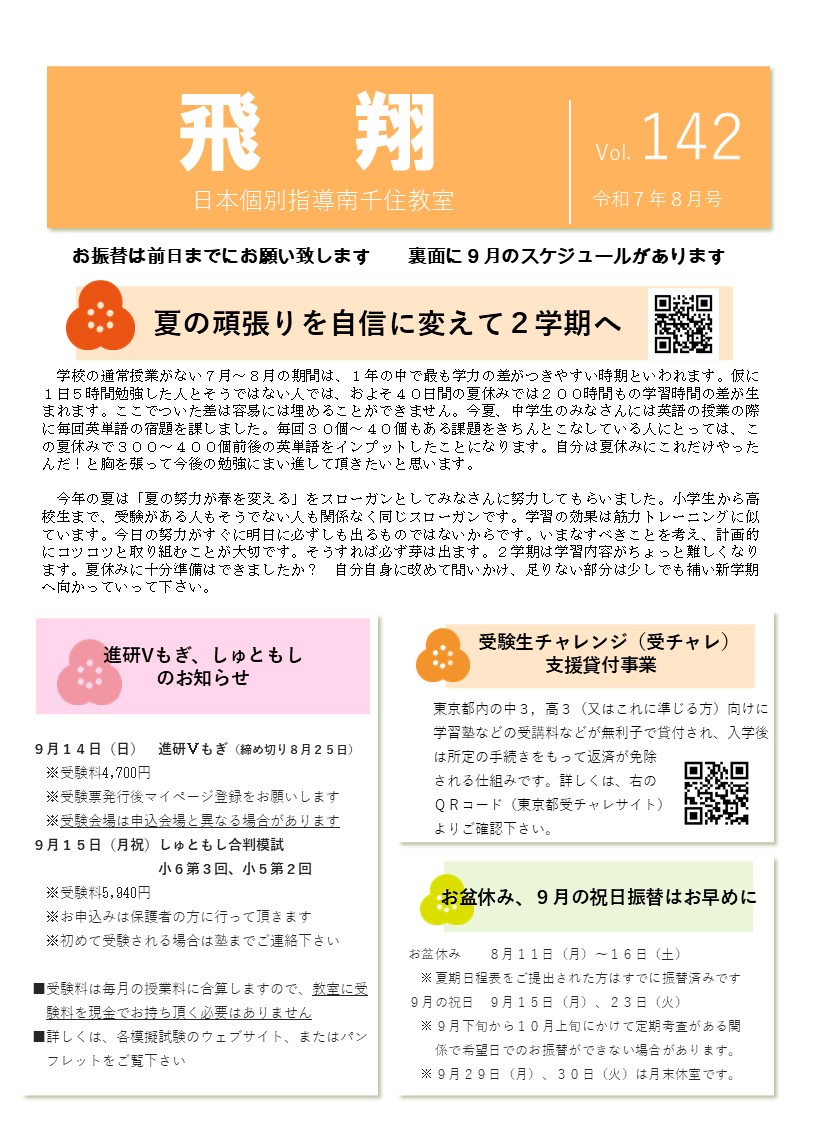 【南千住教室】8月①教室だより「飛翔」8月号