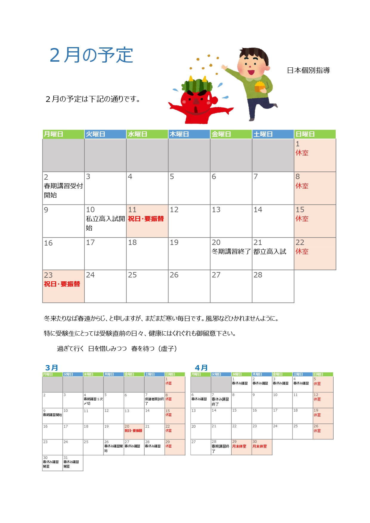 1)2月の予定 2)保護者面談のお知らせ 3)知人・友人紹介キャンペーン 4)各種テスト対策コース