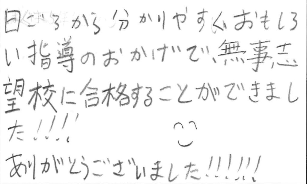 日ごろから分かりやすく、おもしろい指導のおかげで、無事志望校に合格することができました!ありがとうございました!