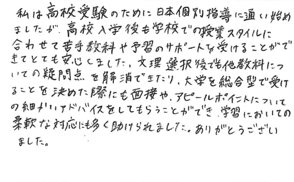私は高校受験のために日本個別指導に通い始めましたが、高校入学後も学校での授業スタイルに合わせて苦手教科や予習のサポートを受けることができてとても安心しました。文理選択後でも他教科についての疑問点を解消できたり、大学を総合型で受けることを決めた際にも面接や、アピールポイントについての細かいアドバイスをしてもらうことができ、学習においての柔軟な対応にも多く助けられました。ありがとうございました。