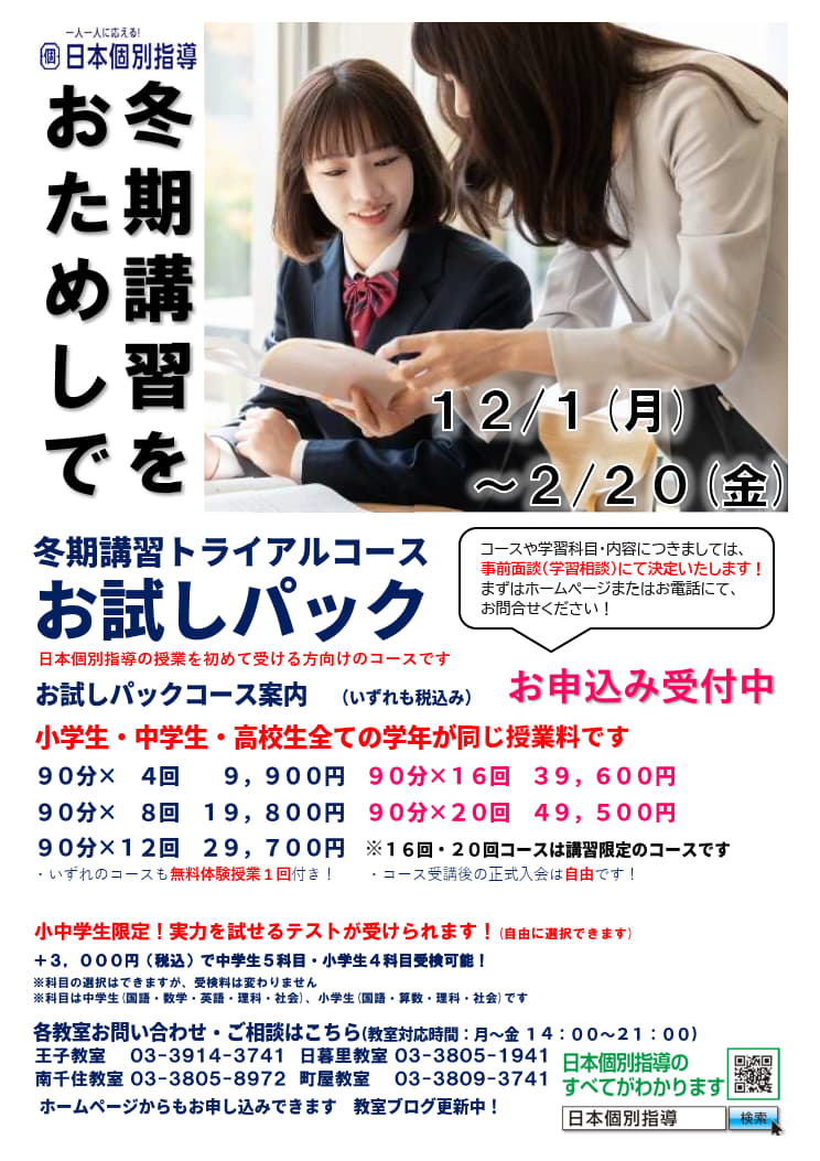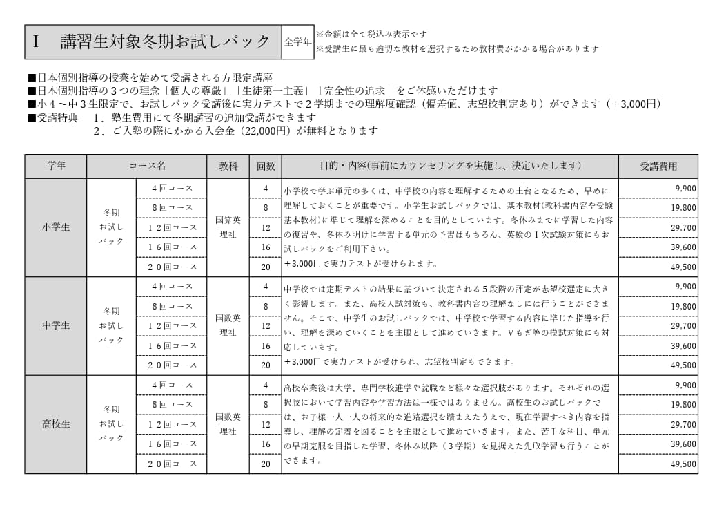 日本個別指導の授業を初めて受ける方におすすめなのが、お試しパックの冬期講習です。 90分授業を各コース回数分の授業料のみのお値段でお試しできます!! 受講後、正式入塾時、入塾金が無料になります。