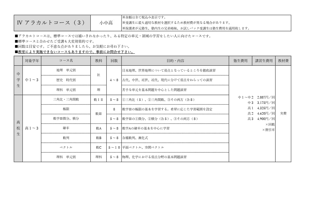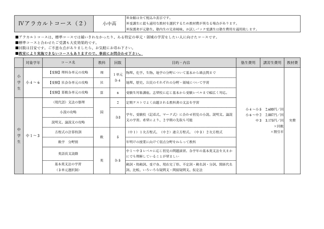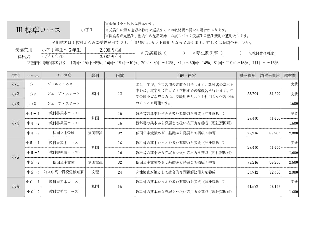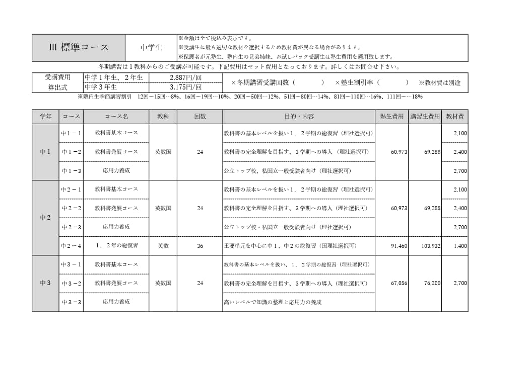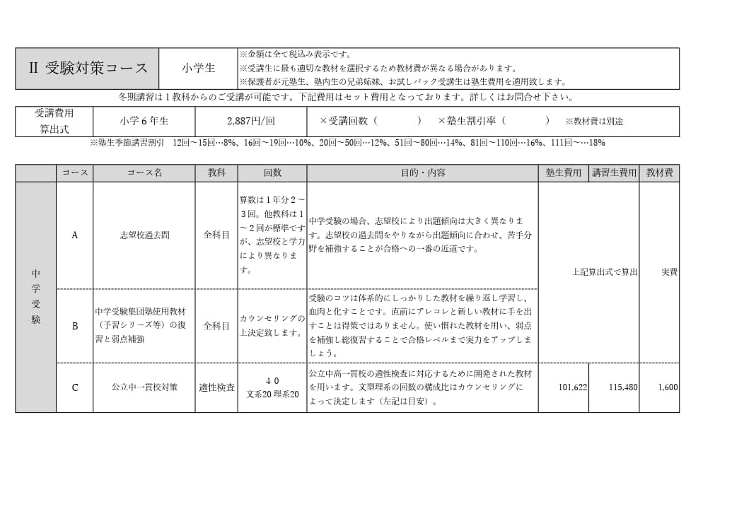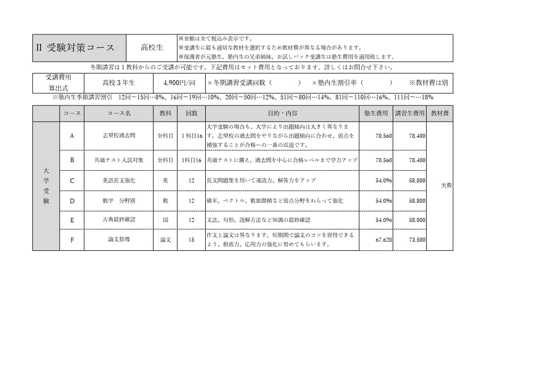 費用は前納制です。塾内生は季節講習割引が適用されます。