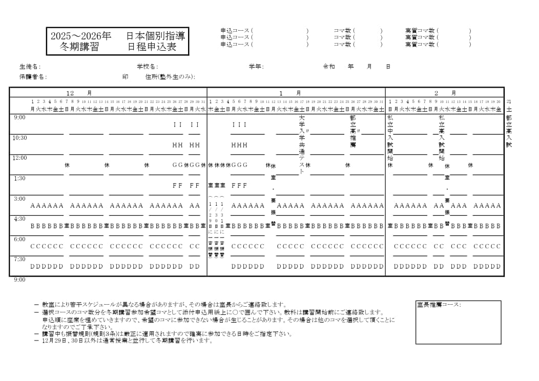 冬休みをはさんだ2~3か月間は、受験生にとっては最後の山場を迎えます。今まで学んだ知識を体系的に整理し、しっかり定着させ、万全の構えで入試当日を迎えましょう。また、受験前年度生にとっては、“先手必勝”の言葉どおり、受験前年度迄の復習を始める時期であり、本格的な受験体制へ移行すべき時期でもあります。(4月から受験勉強を開始しても入試日まで10ヶ月しか有りませんし、殊に中3生は、9月~11月は内申対策と1、2年の復習を同時に行なわねばなりません。)一般の生徒は、普段学習している内容を冬期講習で総復習して確実な実力をつけましょう。一通りの学習をしているだけでは、本当の力にはならず、季節講習で弱点を補強し一学期間の体系的復習をすることが真の実力につながります。 日本個別指導は、生徒一人一人に最適の指導をするという観点より、冬期講習を四つのコースに大別し開講致します。奮ってご参加下さい。