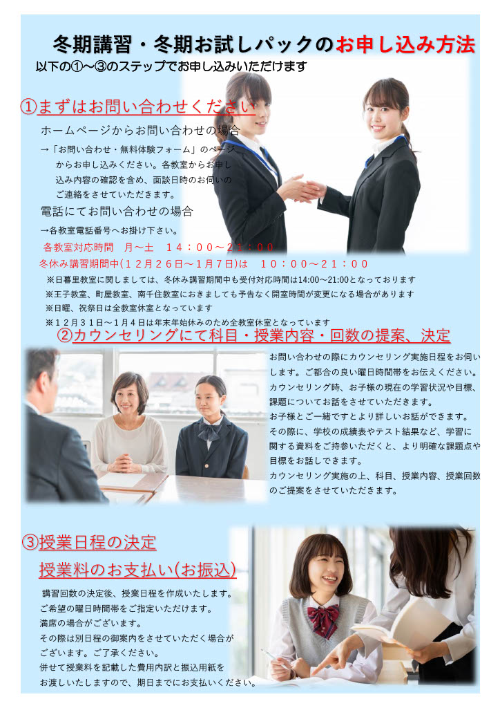冬休み講習 12月26日~1月7日 …7日間、午前9時~午後9時 ※教室により開室時間が異なります (12/31~1/4はお休みです。)